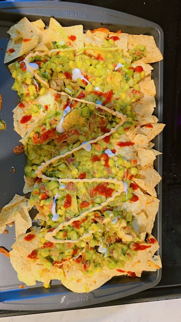 Dinner was light and refreshing: nachos with avocado salad — easy, clean, and satisfying after a sweet-filled afternoon.
